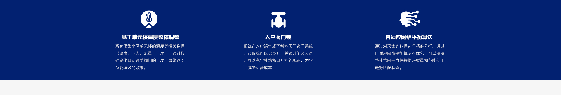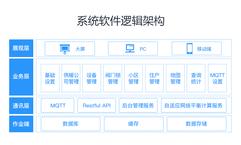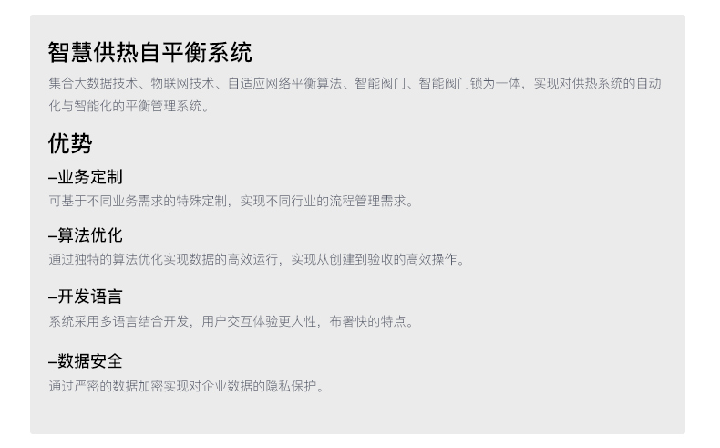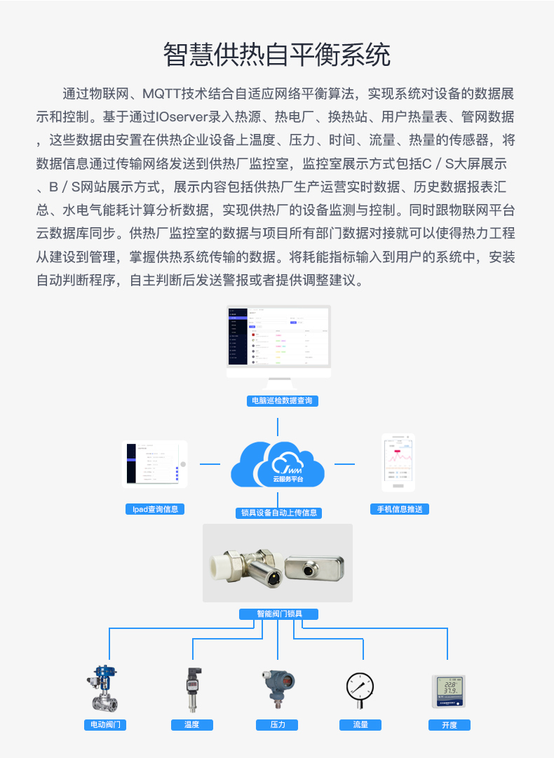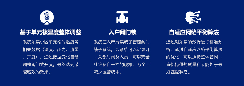 集合大数据技术、物联网技术、自适应网络平衡算法、智能阀门、智能阀门锁为一体,实现对供热系统的自动化与智能化的平衡管理系统。