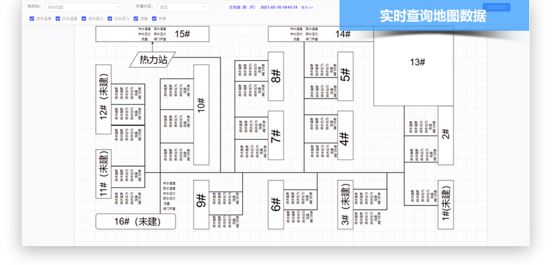 通过物联网、MQTT技术结合自适应网络平衡算法,实现系统对设备的数据展示和控制。基于通过IOserver录入热源、热电厂、换热站、用户热量表、管网数据,这些数据由安置在供热企业设备上温度、压力、时间、流量、热量的传感器,将数据信息通过传输网络发送到供热厂监控室,监控室展示方式包括C/S大屏展示、B/S网站展示方式,展示内容包括供热厂生产运营实时数据、历史数据报表汇总、水电气能耗计算分析数据,实现供热厂的设备监测与控制。同时跟物联网平台云数据库同步。供热厂监控室的数据与项目所有部门数据对接就可以使得热力工程从建设到管理,掌握供热系统传输的数据。将耗能指标输入到用户的系统中,安装自动判断程序,自主判断后发送警报或者提供调整建议。