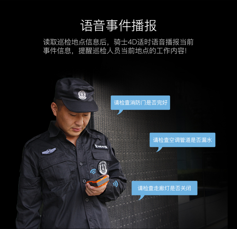 手持骑士4D巡检器巡逻读取地点信息后,适时语音播报当前时间信息,起到督促提醒的作用,减少因为遗忘需要重点巡检的工作而发生重大安全隐患。