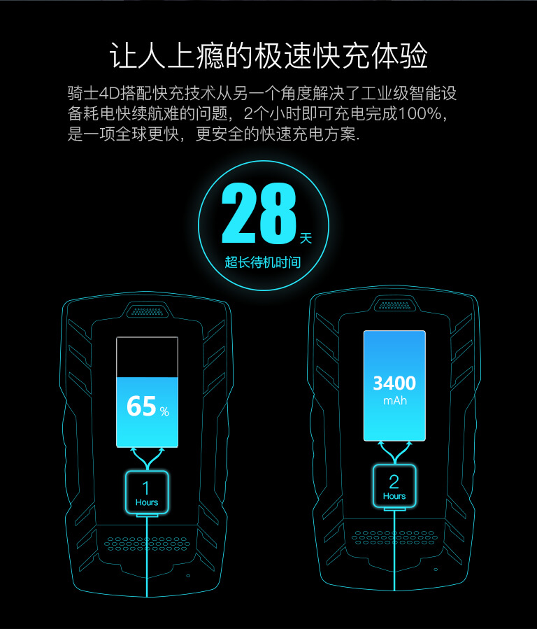 骑士4D搭配快充技术从另一个角度解决了工业级智能设备耗电快续航难的问题,2个小时即可充电完成100%,是一项全球更快,更安全的快速充电方案。