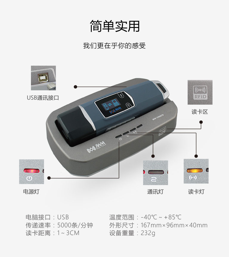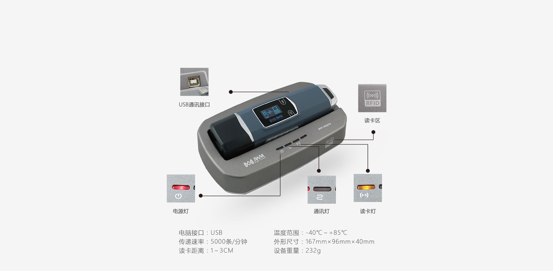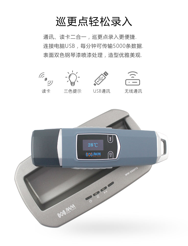 通讯、读卡二合一,巡更点录入更便捷。连接电脑USB,每分钟可传输5000条数据。表面双色钢琴漆喷漆处理,造型优雅美观。