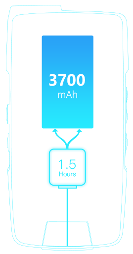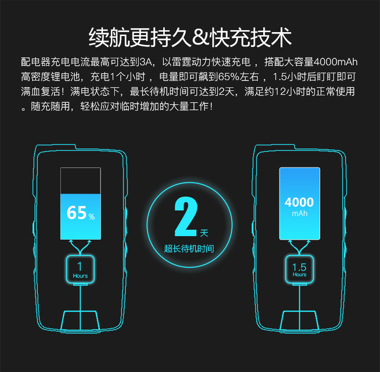 充电器充电电流最高可达到3A,以雷霆动力快速充电 ,搭配大容量3700mAh高密度锂电池,充电1个小时 ,电量即可飙到65%左右 ,1.5小时后盯盯即可满血复活!满电状态下,最长待机时间可达到2天,满足约12小时的正常使用。随充随用,轻松应对临时增加的大量工作!