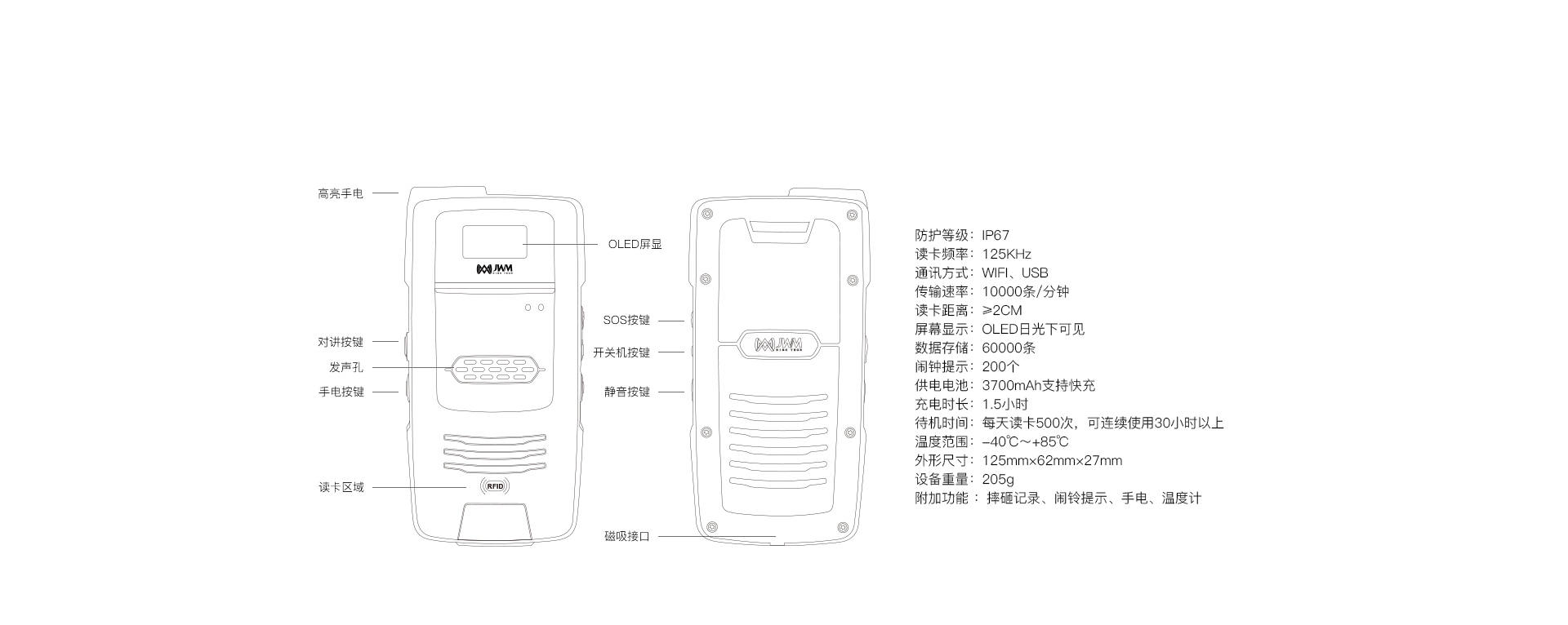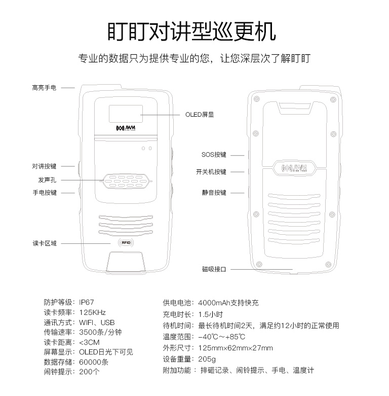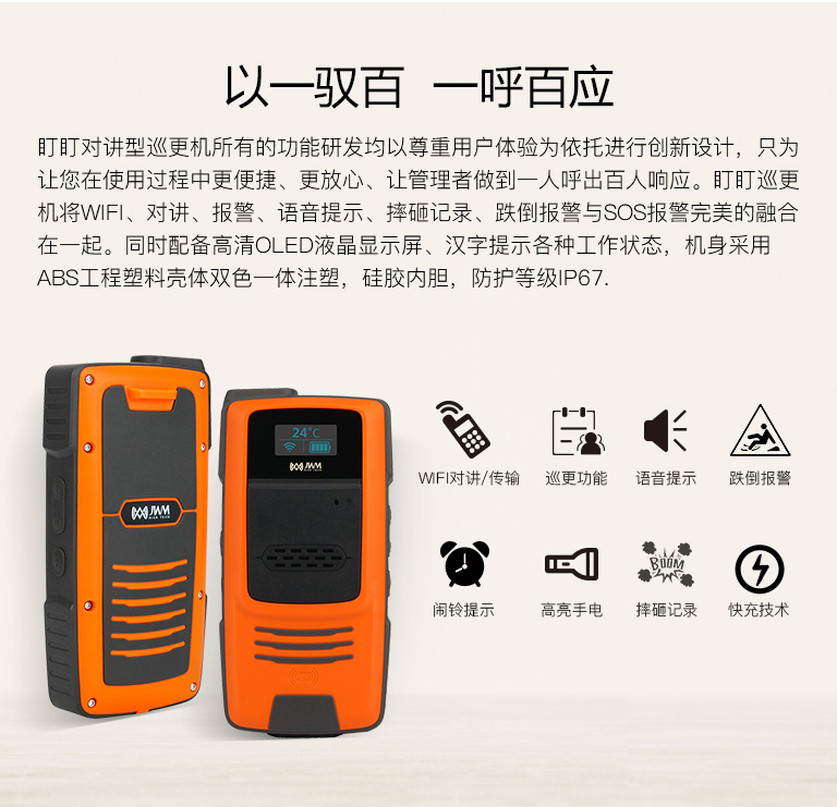 盯盯对讲型巡更机所有的功能研发均以尊重用户体验为依托进行创新设计,只为让您在使用过程中更便捷、更放心、让管理者做到一人呼出百人响应。盯盯巡更机将WIFI、对讲、报警、语音提示、摔砸记录、跌倒报警与SOS报警完美的融合在一起。同时配备高清OLED液晶显示屏、汉字提示各种工作状态,机身采用ABS工程塑料壳体双色一体注塑,硅胶内胆,防护等级IP67.