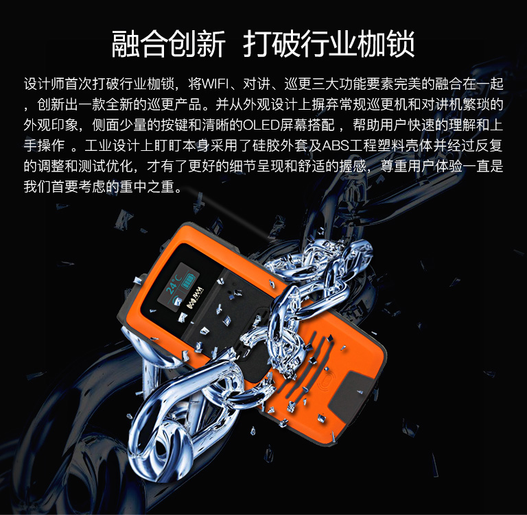 设计师首次打破行业枷锁,将WIFI、对讲、巡更三大功能要素完美的融合在一起,创新出一款全新的巡更产品。并从外观设计上摒弃常规巡更机和对讲机繁琐的外观印象,将更极简的设计理念运用到盯盯对讲巡检器上,侧面少量的按键和清晰的OLED屏幕搭配,帮助用户快速的理解和上手操作。