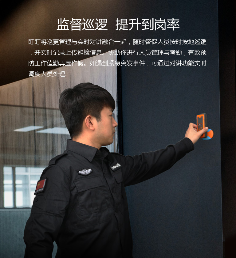 盯盯对讲型巡更机,将巡更管理与实时对讲融合在一起,随时督促人员按时按地巡逻巡检,并实时记录上传巡检信息。巡检数据通过盯盯实时上传至服务中心,后台自动生成工作报表,协助你进行人员管理与考勤,有效预防工作值勤弄虚作假。如遇到紧急突发事件,可通过对讲功能实时调度人员处理。