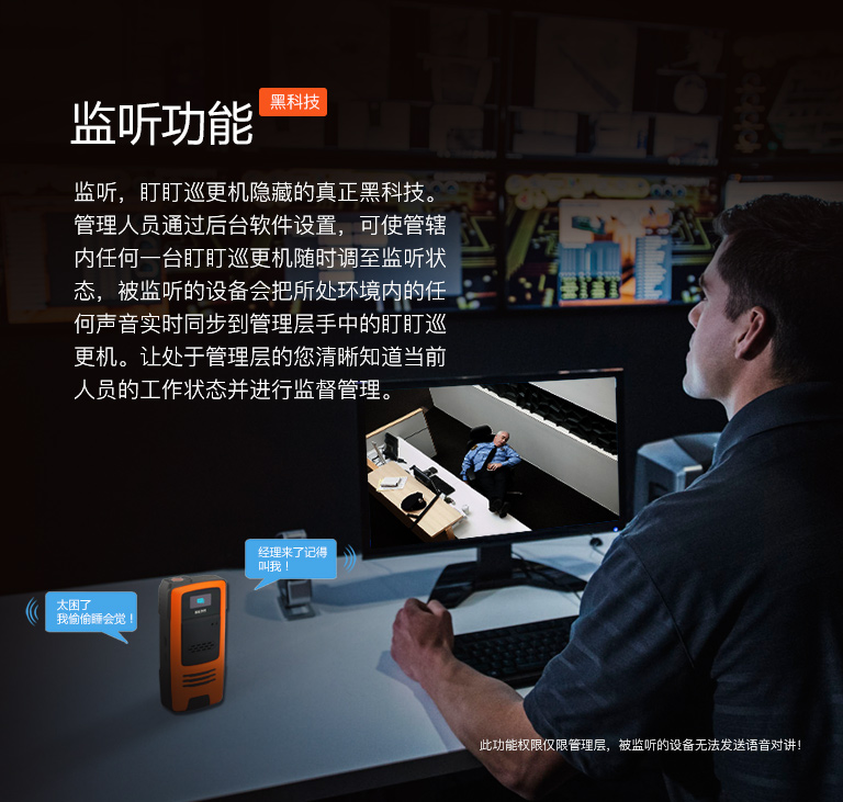 监听,盯盯巡更机隐藏的真正黑科技。管理人员通过后台软件设置,可使管辖内任何一台盯盯巡更机随时调至监听状态,被监听的设备会把所处环境内的任何声音实时同步到管理层手中的盯盯巡更机。让处于管理层的您清晰知道当前人员的工作状态并进行监督管理。