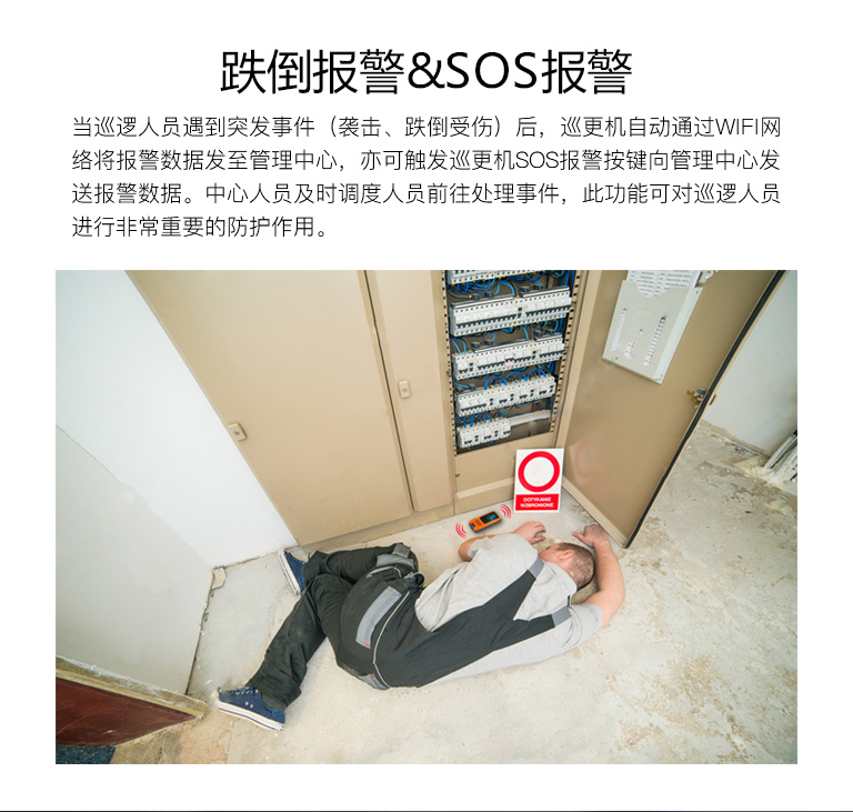 当巡逻人员遇到突发事件(袭击、跌倒受伤)后,巡更机自动通过WIFI网络将报警数据发至管理中心,亦可触发巡更机SOS报警按键向管理中心发送报警数据,盯盯巡更机并伴随蓝色灯光秒闪提示人员位置,直到收到服务器回复。中心人员及时调度人员前往处理事件,此功能可对巡逻人员进行非常重要的防护作用。