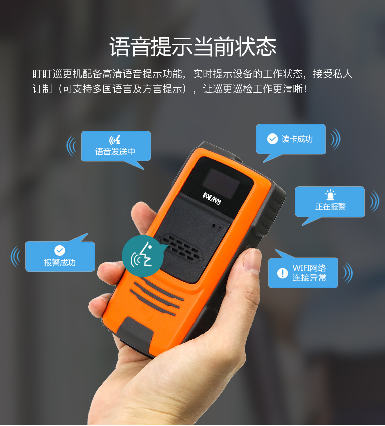 盯盯巡更机配备高清语音提示功能,实时提示设备的工作状态,接受私人订制(可支持多国语言及方言提示),