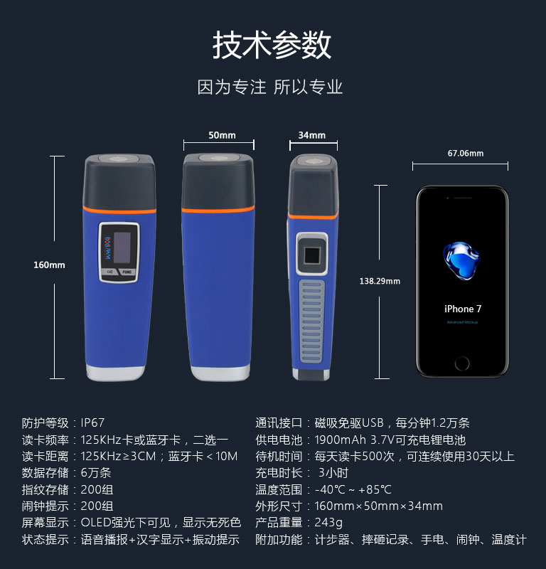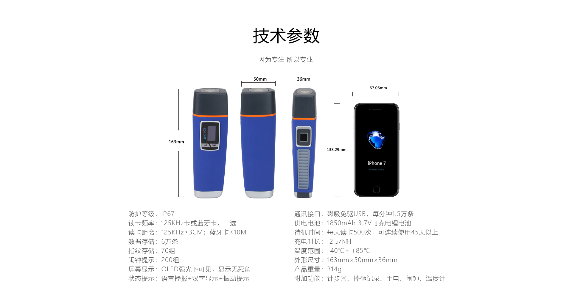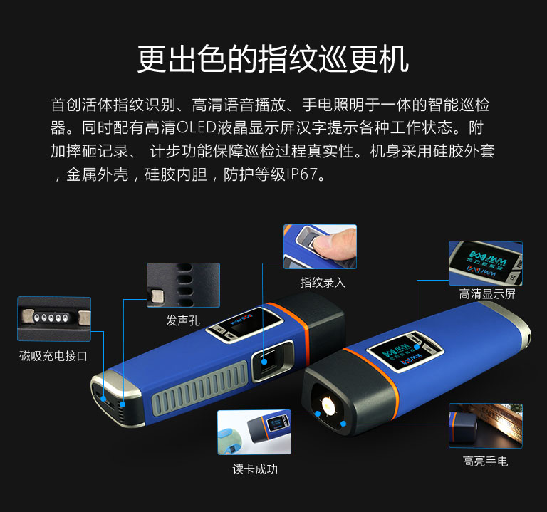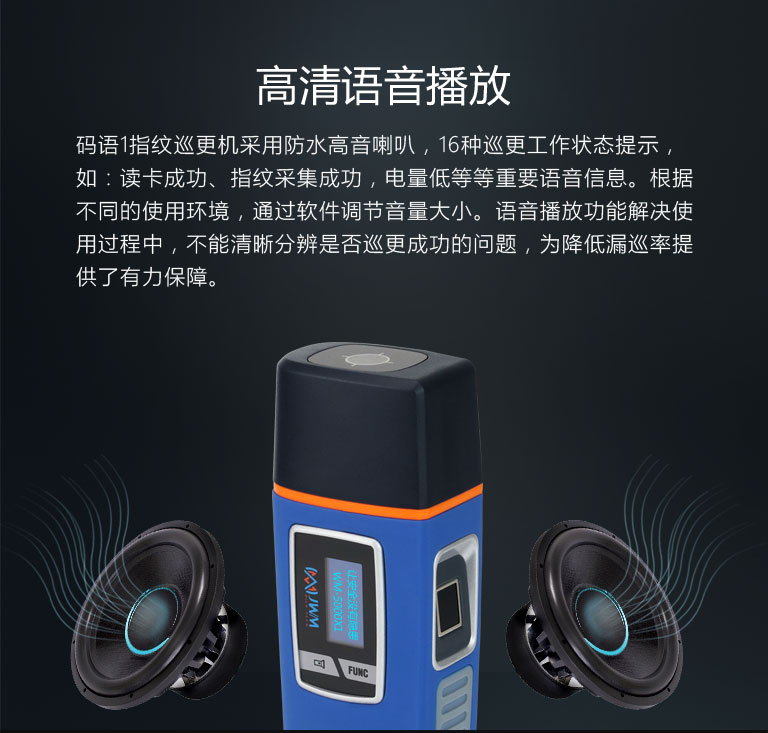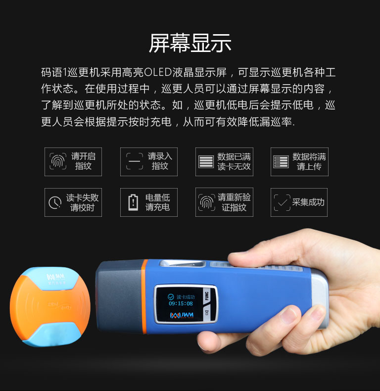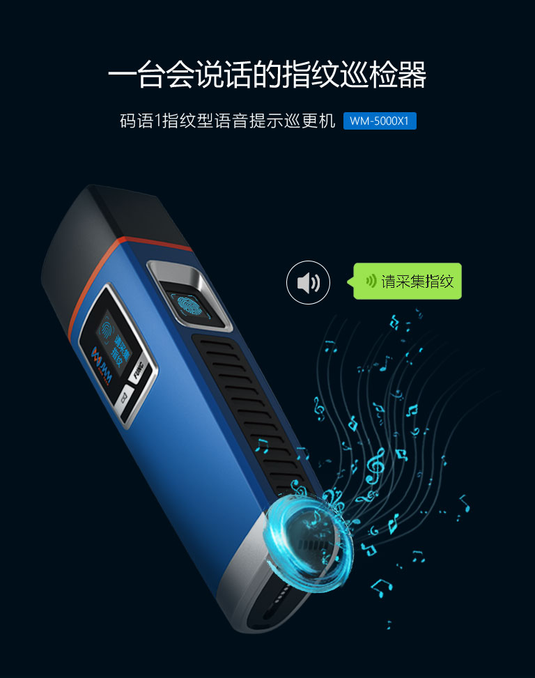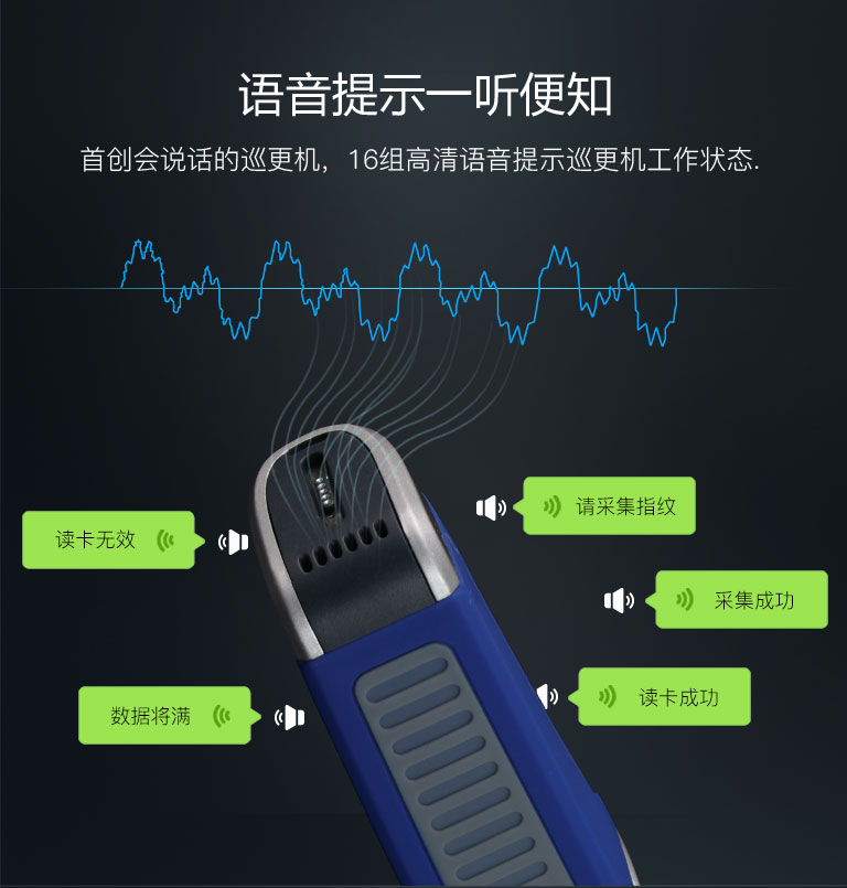 活体指纹识别、360采集、干湿手指均可。16组语音结合高清显示屏,提示巡更机各种工作状态。200组闹钟提醒与计步器功能,有效降低漏巡率。