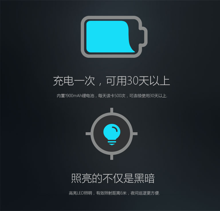 内置1850mAh锂电池,每天读卡500次,可连续使用45天以上.